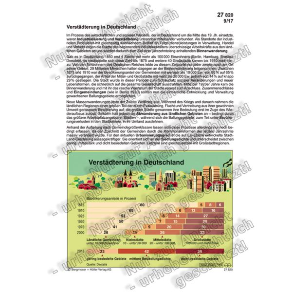 Gab es in Deutschland 1850 erst 4 Städte mit mehr als 100000 Einwohnern (Berlin, Hamburg, Breslau, Dresden), so verdoppelte sich diese Zahl bis 1875 und weitere 40 Großstädte kamen bis 1910 noch hinzu. Von den Einwohnern des Deutschen Reiches lebte zu diesem Zeitpunkt nur jeder zweite noch am Ort seiner Geburt; 29 Millionen Menschen hatten dagegen an der Binnenwanderung teilgenommen. Zwischen 1875 und 1910 war der Bevölkerungsanteil der Gemeinden mit weniger als 10000 Ew. von 80 % auf 65 % zurückgegangen, der Anteil der Mittel- und Großstädte mit mehr als 20000 Ew. jedoch von 14 auf knapp 29 % gestiegen. Die Stadt wurde in dieser Periode zum Schauplatz sozialer Veränderungen und neuer Lebensformen, die schließlich auf die gesamte Gesellschaft ausstrahlten. Mitte der 1920er Jahre kam die Binnenwanderung und mit ihr das rasche Wachstum der Städte vorerst zum Abschluss. Zusammenschlüsse und Eingemeindungen (wie in Berlin 1920) sollten nun die einheitliche Entwicklung und Verwaltung gewachsener Ballungsgebiete ermöglichen.